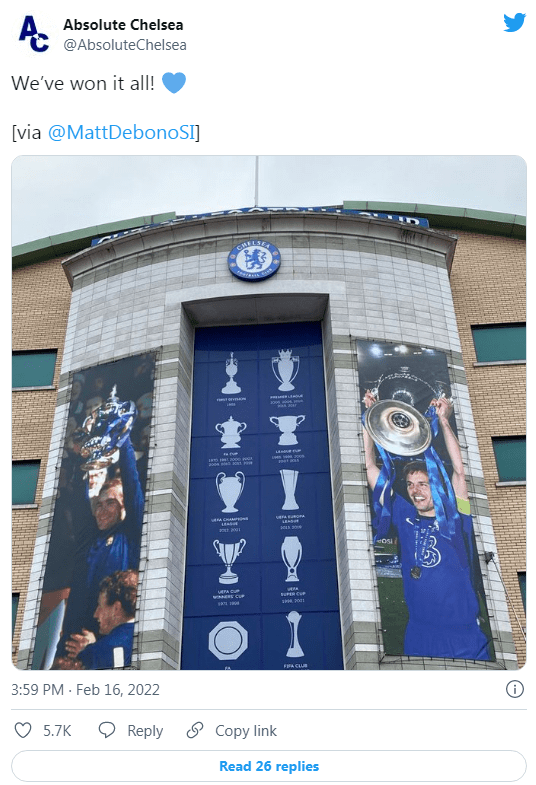 Болельщики «Челси» положительно отреагировали на появлениенового баннера с трофеем клубного чемпионата мира на «Стэмфорд Бридж».