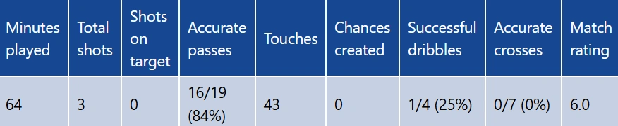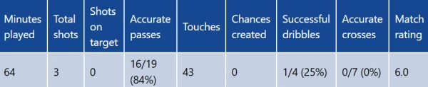 Арендованный игрок «Челси» продержался на поле чуть больше часа в воскресном матче Лиги 1. Его статистика за 64 минуты игры выглядит так: